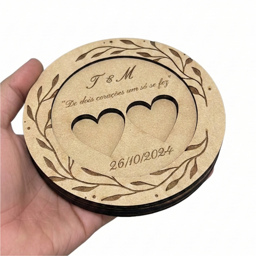 Personalização Total: O modelo da foto é apenas um exemplo. Você personaliza com as iniciais ou nomes dos noivos, a data do casamento e uma frase curta de sua escolha.