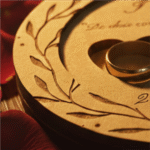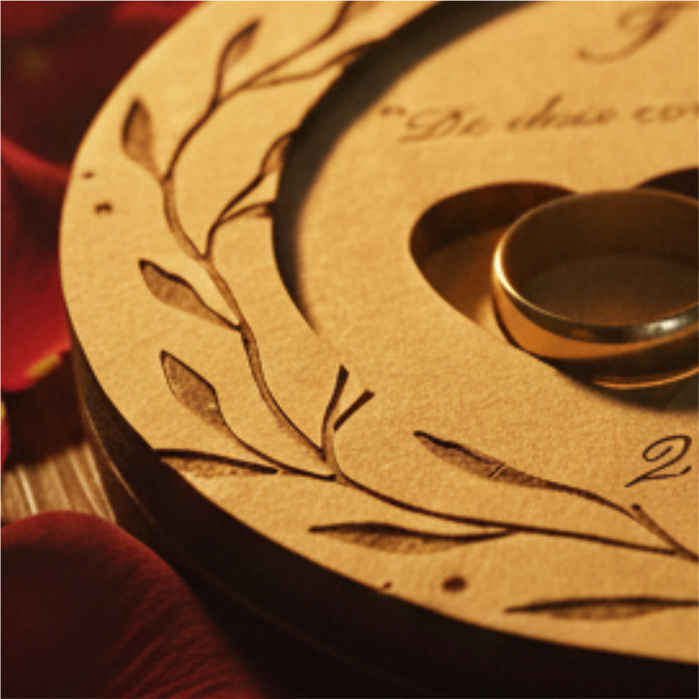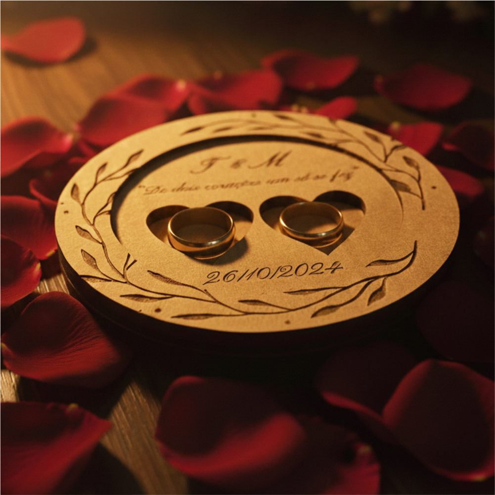 A peça é trabalhada com precisão através de corte e gravação a laser. Possui uma borda decorada e dois encaixes centrais em formato de coração, projetados para segurar as alianças de forma segura durante a entrada dos pajens ou daminhas.